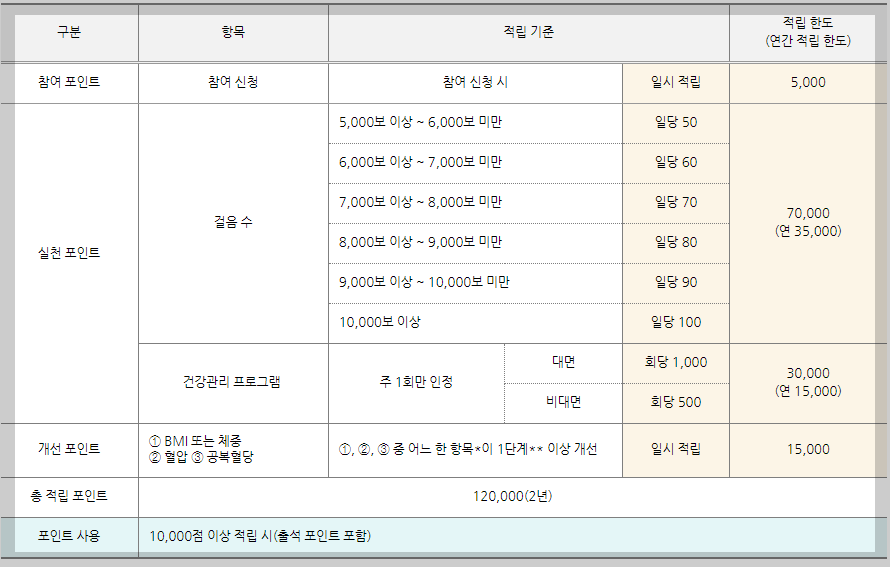 적립조건 | 걷기,건강관리프로그램 이수등 건강생활 실천 활동과건강 개선 결과에 따라 적립 |