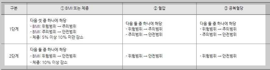 신청대상 | 예방형 | 일반건강검진 결과 건강위험 그룹에 포함되는 사람 체질량지수(BMI)가 25 이상이면서 혈압이 120/80㎜Hg 이상이거나, 공복혈당이 100㎎/dL 이상 |