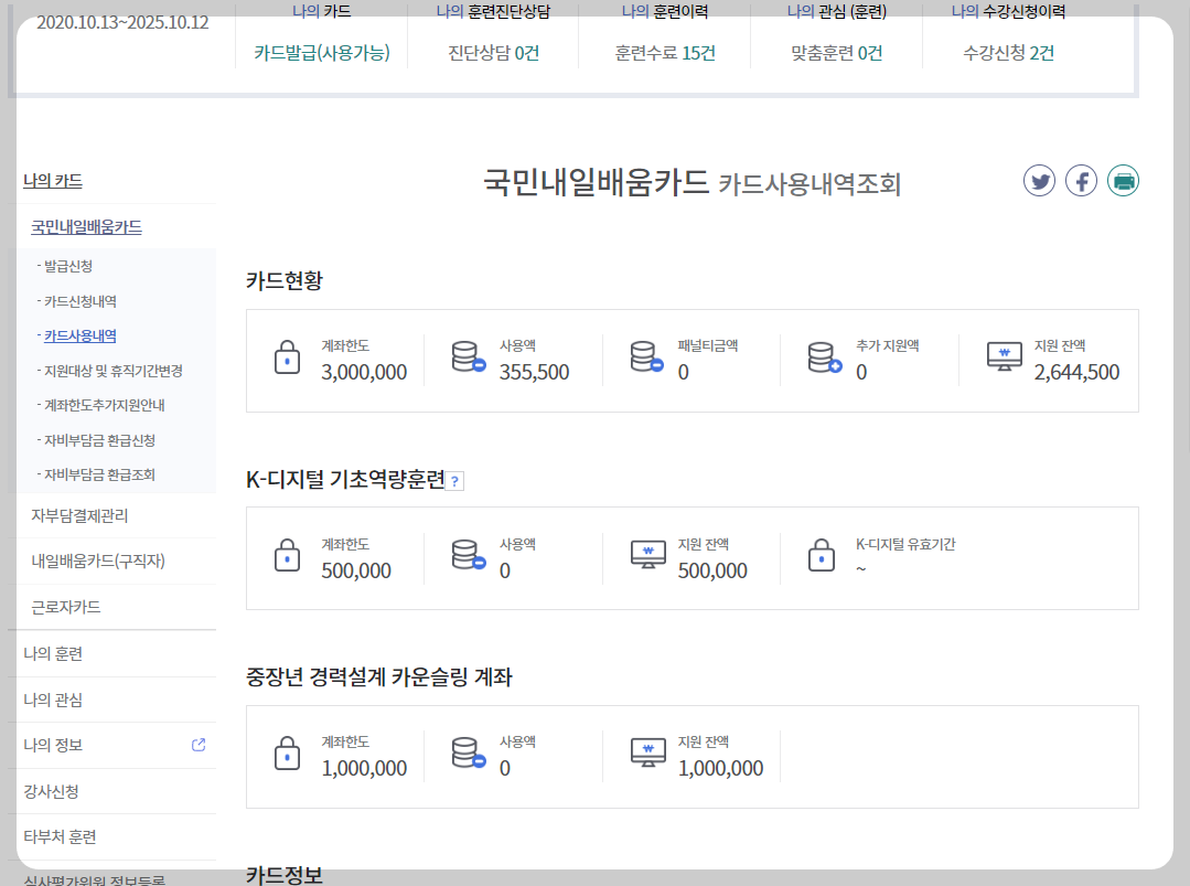 국비지원 훈련과정은 세금으로 운영되다 보니까 인당 사용금액이 제한되어 있습니다. 내가 그동안 수강한 과정내역 및 앞으로 사용가능한 잔액 확인은 아래에서 확인하시기 바랍니다.