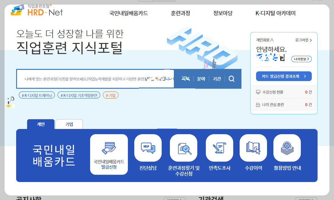 고등학생이 아닌 일반인은 바로 아래에서 국민내일 배움 카드 발급하기를 진행하시면 됩니다.