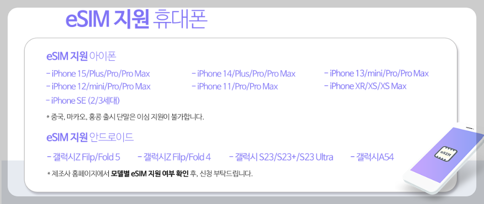 esim지원되는 휴대폰은 아래에서 확인하시기 바랍니다.