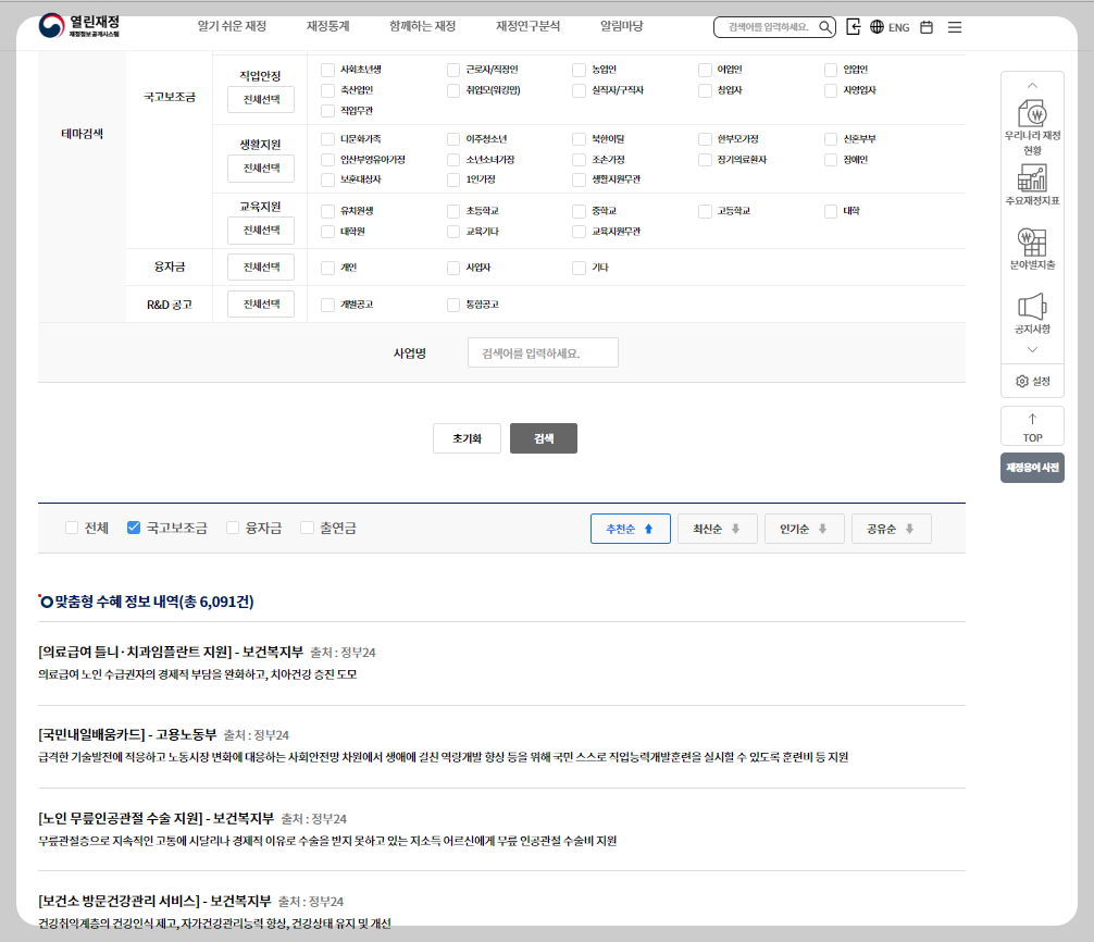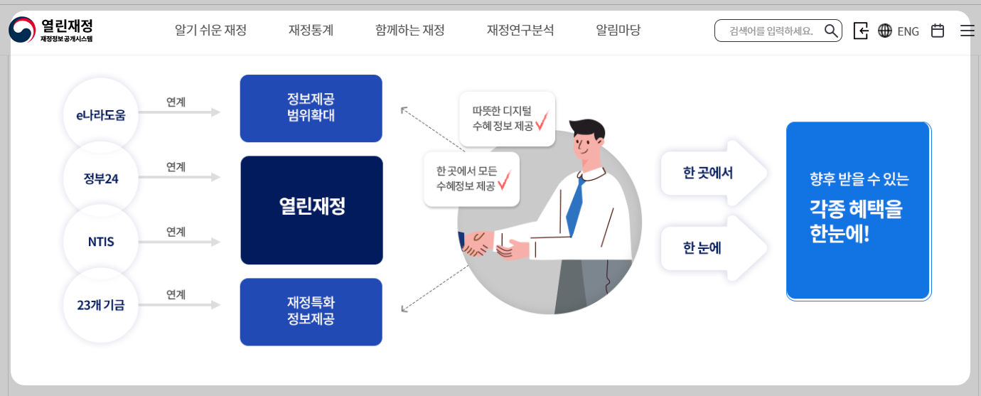 그래서 보조금 24나 복지멤버십보다 더 다양한 혜택들을 기획재정부를 통해 찾아볼 수 있는데요. 바로 기획재정부에서 운영하는 열린 재정이라는 사이트에서 확인할 수 있습니다.