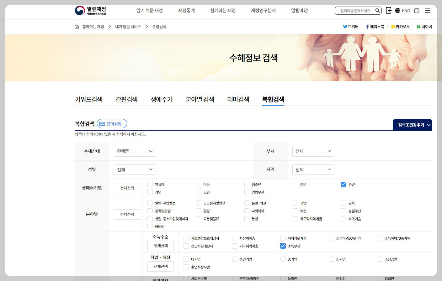 저는 제가 받을 수 있는 수혜 정보를 복합 검색으로 찾아볼 건데요. 혜택이 가장 적다고 할 수 있는 중년으로 선택하고 분야는 전체 선택 소득 수준은 소득 무관, 취업, 직장 무관, 직업 무관, 1인 가정교육지원 무관 사업자로 선택해서 검색해 보겠습니다.