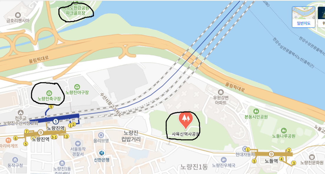 한강대교, 노들섬, 이촌한강공원, 사육신공원, 남산 N타워, 양화한강공원, 용봉정 근린공원, 노향진 수산시장등이 있습니다. 특히 용산역에서 내려서 정국숲 4호가 최고의 명당자리라고 합니다.