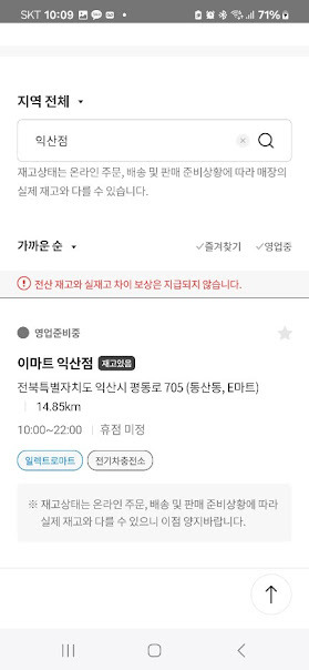 이마트앱에서 단골매장으로 지정한 곳의 재고를 보여주고 다른 점포 재고확인도 가능합니다